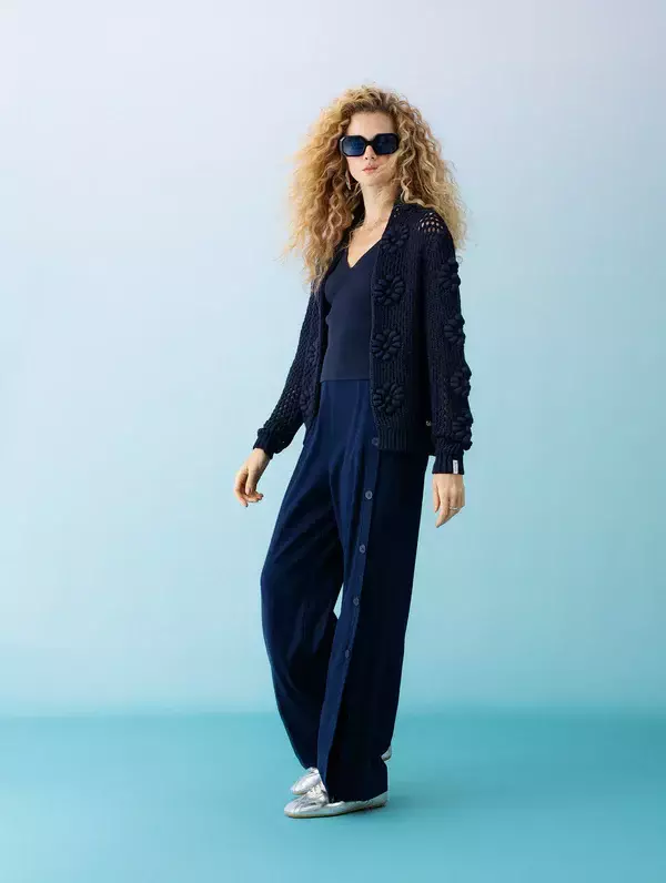 Com tricô em ponto margarida que remete ao desenho de flores, o casaco em algodão com pontos vazados e mangas de cava posta da Biamar surpreende no visual. É a terceira peça perfeita para criar looks delicados e sofisticados.